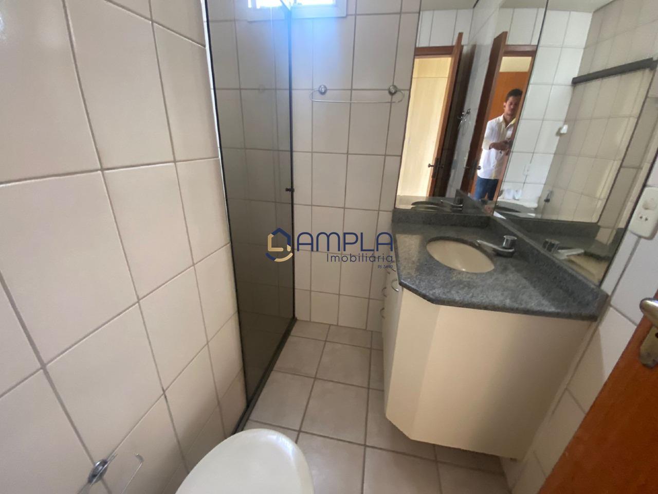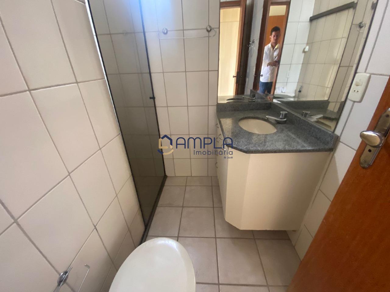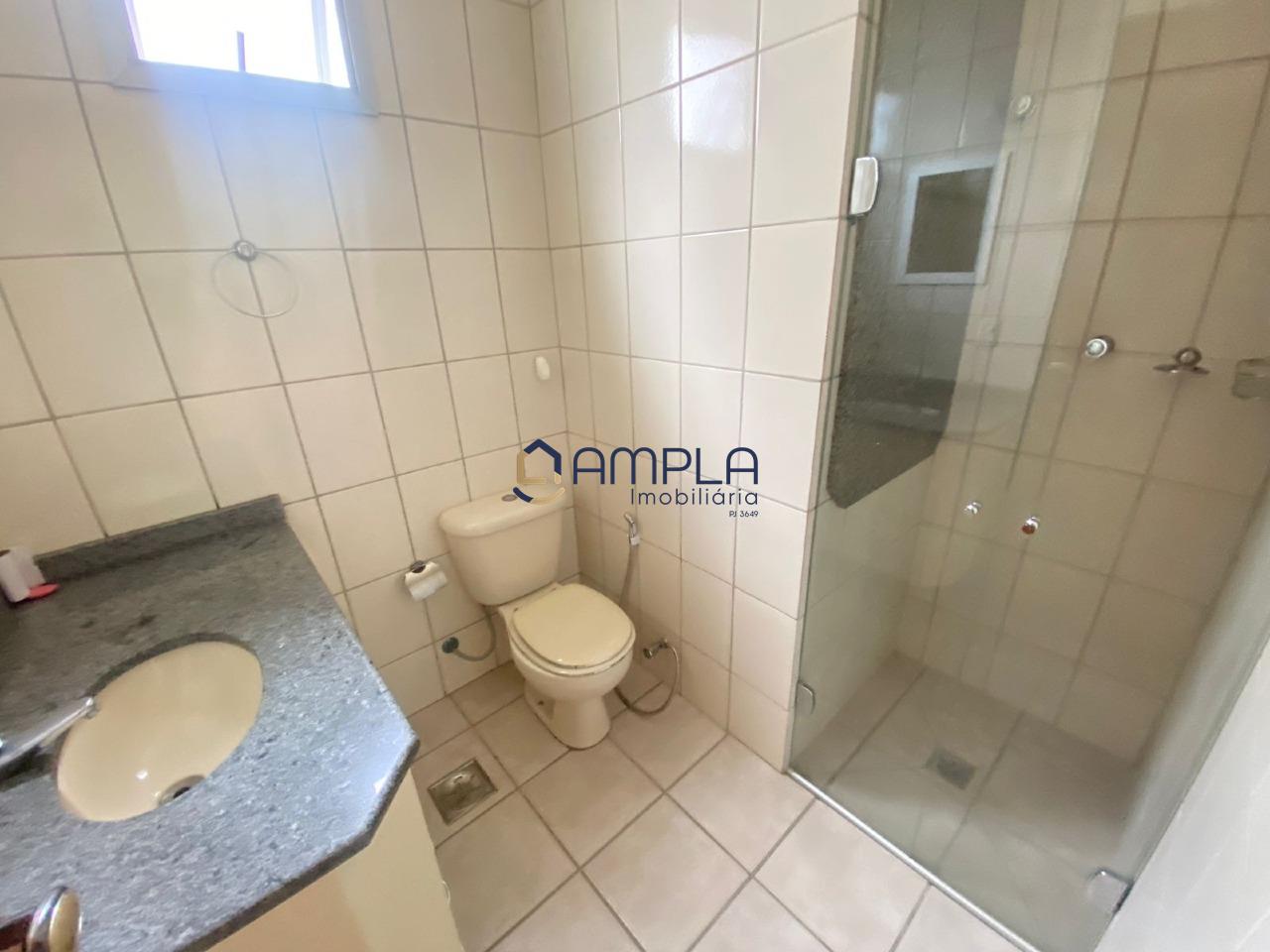 banho social com armários, bancada em granito e piso em cerâmica;